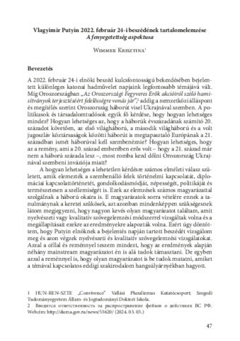 | Egyéb cím: | Content analysis of Vladimir Putin’s speech of 24 February 2022 Te threat aspect |