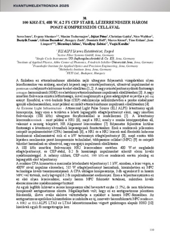Seres Imre; Shestaev Evgeny; Tschernajew Maxim; Jójárt Péter; Gaida Christian; Walther Nico; Bartyik Tamás; Gilicze Barnabás; Bengery Zsolt; Hoff Dominik; Kienel Marco; Eidam Tino; Limpert Jens; Börzsönyi Ádám; Várallyay Zoltán; Varjú Katalin: 100 KHZ-es, 400 W, 6.2 FS CEP stabil lézerrendszer három poszt-kompressziós cellával.