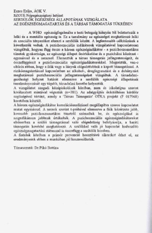 Eszes Erika: Serdülők egészségi állapotának vizsgálata az egészségmagatartás és a társas támogatás tükrében : [absztrakt].