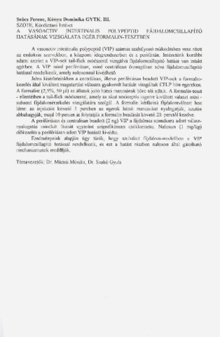 Szűcs Ferenc; Kónya Dominika: A vasoactiv intestinalis polypeptid fájdalomcsillapító hatásának vizsgálata egér formalin-tesztben : [absztrakt].