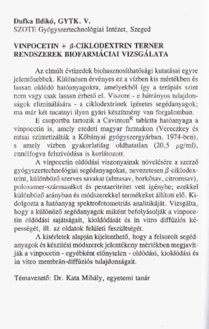 Dufka Ildikó: Vinpocetin + β-ciklodextrin terner rendszerek biofarmáciai vizsgálata : [absztrakt].