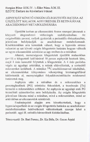 Forgács Péter; Eiler Nóra: Asphyxiát követő oxigén lélegeztetés hatása az újszülött malacok agyi ereinek és retinájának arachidonsav metabolizmusára : [absztrakt].
