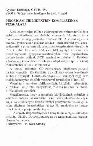 Gyökér Dorottya: Piroxicam-ciklodextrin komplexeinek vizsgálata : [absztrakt].