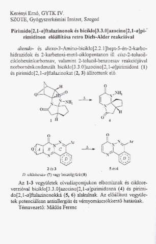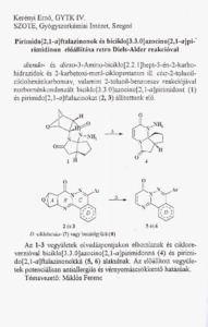 Kerényi Ernő: Pirimido[2,1-a]ftalazinonok és biciklo[3.3.0]azocino[2,1-a]pirimidinon előállítása retro Diels-Alder reakcióval : [absztrakt].