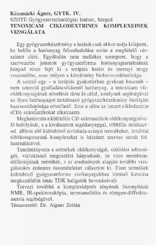 Kézsmárki Ágnes: Tenoxicam ciklodextrines komplexeinek vizsgálata : [absztrakt].