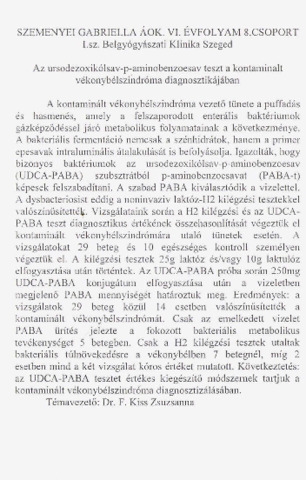 Szemenyei Gabriella: Az ursodezoxikólsav-p-aminobenzoesav teszt a kontaminalt vékonybélszindróma diagnosztikájában : [absztrakt].