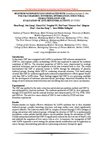 Rong Shan; Liang Jun; Xu Xiaoyi; Yi Yongkui; Yuan Hui; Gao Xiaoyan; Zhao Qingxue; Song Gaochen; Szilágyi Imre Miklós: Selenium nanoparticles conjugated with Scutellaria barbata D. Don polysaccharides: synthesis, optimization, structural characterization and evaluation of anti-hepatoma activity in vitro : [abstract].