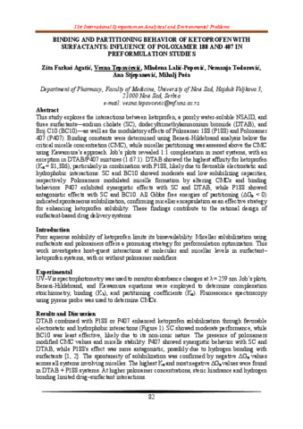 Farkaš Agatić Zita; Tepavčević Vesna; Lalić‑Popović Mladena; Todorović Nemanja; Stjepanović Ana; Poša Mihalj: Binding and partitioning behavior of ketoprofen with surfactants: influence of Poloxamer 188 and 407 in preformulation studies.