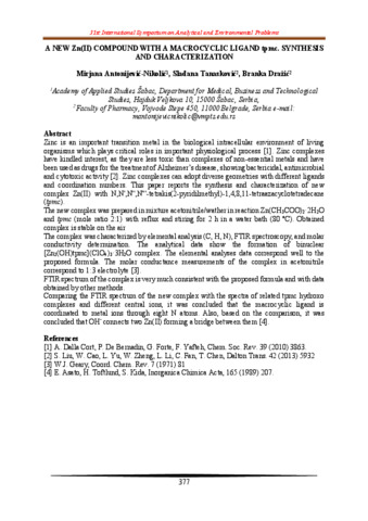 Antonijević-Nikolić Mirjana; Tanasković Sladana; Dražić Branka: A new Zn(II) compound with a macrocyclic ligand tpmc : synthesis and characterization : [abstract].
