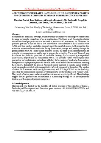 Zsarkó Katarina; Budimac Tara; Ranitović Aleksandra; Šovljanski Olja; Cvetković Dragoljub; Marić Teodora; Sörös Zita: Addition of encapsulated Lactobacillus hilgardii in pea protein for obtaining kombucha beverage with probiotic properties : [abstract].