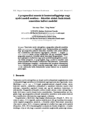 Szécsényi Tibor; Virág Nándor: A pragmatikai annotáció kontextusfüggősége nagy nyelvi modell esetében - felszólító alakok funkcióinak annotálása huBert modellel.