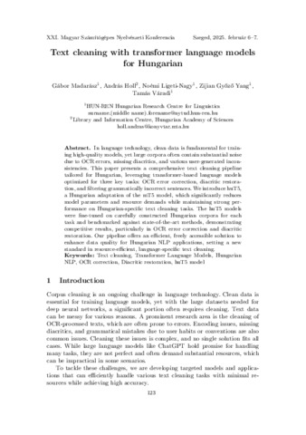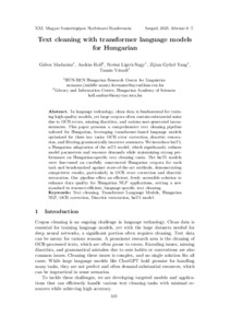 Madarász Gábor; Holl András; Ligeti-Nagy Noémi; Yang Zijian Győző; Váradi Tamás: Text cleaning with transformer language models for Hungarian.