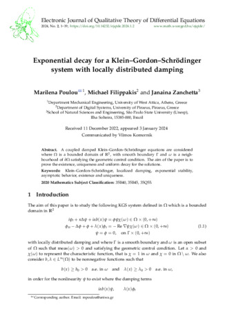 Poulou Marilena N.; Filippakis Michael; Zanchetta Janaina P: Exponential decay for a Klein-Gordon-Schrödinger system with locally distributed damping. (2024)