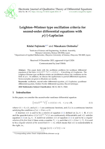 Fujimoto Kodai; Onitsuka Masakazu: Leighton-Wintner type oscillation criteria for second-order differential equations with p(t)-Laplacian. (2024)