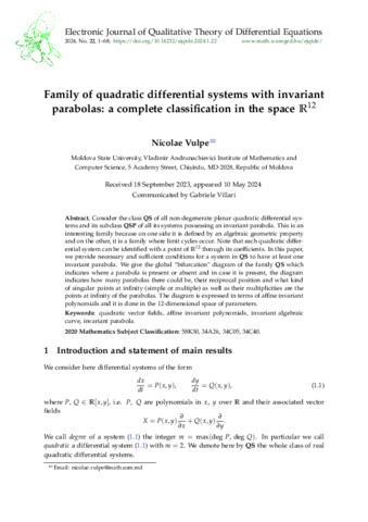 Vulpe Nicolae: Family of quadratic differential systems with invariant parabolas: a complete classification in the space R12. (2024)