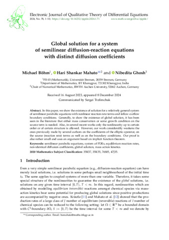 Böhm Michael; Mahato Hari Shankar; Ghosh Nibedita: Global solution for a system of semilinear diffusion-reaction equations with distinct diffusion coefficients. (2024)