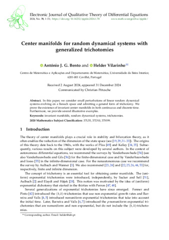 Bento António J. G.; Vilarinho Helder: Center manifolds for random dynamical systems with generalized trichotomies. (2024)