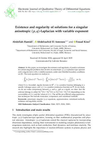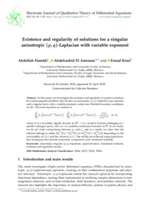 Hamidi Abdellah; Amrouss Abdelrachid El; Kissi Fouad: Existence and regularity of solutions for a singular anisotropic (p, q)-Laplacian with variable exponent. (2025)