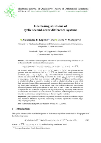 Kapešić Aleksandra B.; Manojlovic Jelena V.: Decreasing solutions of cyclic second-order difference systems. (2025)