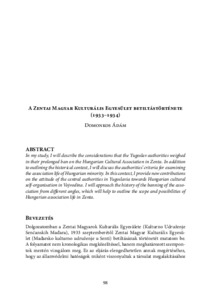 In my study, I will describe the considerations that the Yugoslav authorities weighed in their prolonged ban on the Hungarian Cultural Association in Zenta. In addition to outlining the historical context, I will discuss the authorities’ criteria for examining the association life of Hungarian minority. In this context, I provide new contributions on the attitude of the central authorities in Yugoslavia towards Hungarian cultural self-organisation in Vojvodina. I will approach the history of the banning of the association from different angles, which will help to outline the scope and possibilities of Hungarian association life in Zenta.