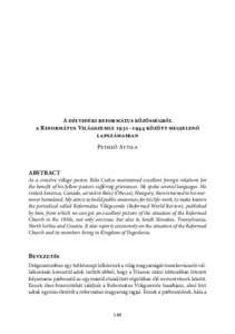 As a creative village pastor, Béla Csekes maintained excellent foreign relations for the benefit of his fellow pastors suffering grievances. He spoke several languages. He visited America, Canada, served in Bečej (Óbecse), Hungary, then returned to his narrower homeland. My aim is to build public awareness for his life-work, to make known the periodical called Református Világszemle (Reformed World Review), published by him, from which we can get an excellent picture of the situation of the Reformed Church in the 1930s, not only overseas, but also in South Slovakia, Transylvania, North Serbia and Croatia. It also reports extensively on the situation of the Reformed Church and its members living in Kingdom of Yugoslavia.