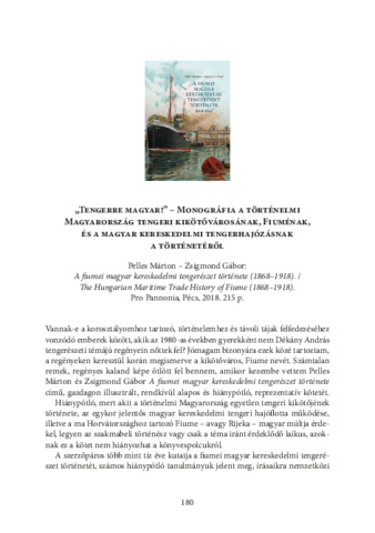 Döbör András: "Tengerre magyar!" - monográfia a történelmi Magyarország tengeri kikötővárosának, Fiuménak, és a magyar kereskedelmi tengerhajózásnak a történetéről : [könyvismertetés]. In: Délvidéki szemle, (12) 1-2. pp. 180-182. (2025)