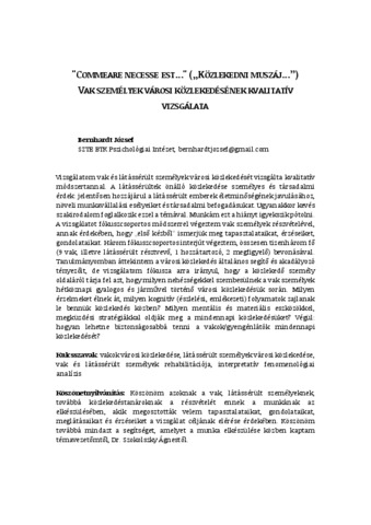 Bernhardt József: "Commeare necesse est..." ("közlekedni muszáj...") vak személyek városi közlekedésének kvalitatív vizsgálata. In: Impulzus : szegedi pszichológiai tanulmányok, (10) 1. pp. 1-24. (2023)