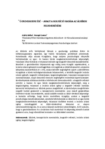 Győry Réka; Faragó Laura: Gondolkodni ér! - avagy a kogníció hatása az álhírek felismerésére. In: Impulzus : szegedi pszichológiai tanulmányok, (10) 1. pp. 1-20. (2023)