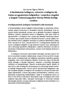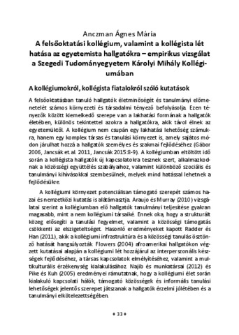 Anczman Ágnes Mária: A felsőoktatási kollégium, valamint a kollégista lét hatása az egyetemista hallgatókra - empirikus vizsgálat a Szegedi Tudományegyetem Károlyi Mihály Kollégiumában. In: Tanulmányok a társadalomról VII. : A Szegedi Tudományegyetem JGYPK Alkalmazott Társadalomtudományok Tanszék, az ETSZK Szociális Munka és Szociálpolitika Tanszék, a BTK Szociológia Tanszék és az ÁJTK Politológiai Tanszék tudományos diákköri munkái, (7). pp. 33-56. (2025)
