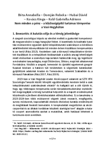 Bóta Annabella; Domján Rebeka; Hubai Dávid; Kovács Kinga; Kobl Gabriella Adrienn: Nem minden a pénz - a közösségépítő turizmus térnyerése a Vasi-Hegyháton. In: Tanulmányok a társadalomról VII. : A Szegedi Tudományegyetem JGYPK Alkalmazott Társadalomtudományok Tanszék, az ETSZK Szociális Munka és Szociálpolitika Tanszék, a BTK Szociológia Tanszék és az ÁJTK Politológiai Tanszék tudományos diákköri munkái, (7). pp. 57-77. (2025)