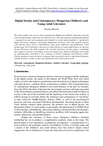 Bencsik Orsolya: Digital society and contemporary Hungarian children's and young adult literature.