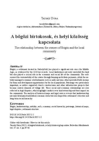 Tassaly Dóra: A bögözi birtokosok, és helyi közösség kapcsolata = The relationship between the owners of Bögöz and the local community. In: Belvedere Meridionale, (37) 3. pp. 39-46. (2025)