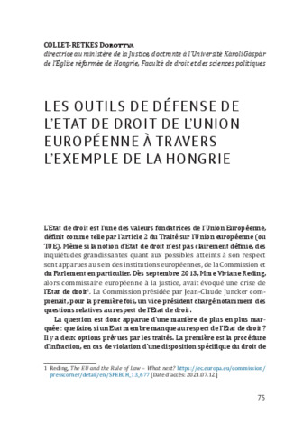Collet-Retkes Dorottya: Les outils de défense de l'Etat de droit de l'Union européenne à travers l'exemple de la Hongrie. In: La séparation des pouvoirs jadis et maintenant - l'indépendance de la justice, (12). pp. 75-95. (2024)
