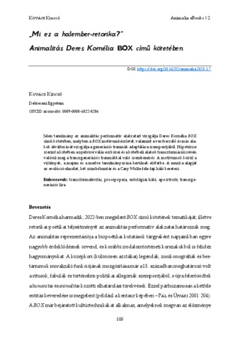 Kovács Kincső: "Mi ez a halember-retorika?" : animalitás Deres Kornélia BOX című kötetében. In: Állatszimbolika : vizuális és verbális interakciók az európai kultúrtörténetben, (2). pp. 105-118. (2025)