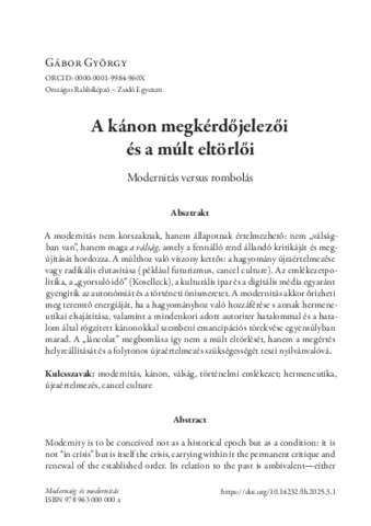 A modernitás nem korszaknak, hanem állapotnak értelmezhető: nem „válságban van”, hanem maga a válság, amely a fennálló rend állandó kritikáját és megújítását hordozza. A múlthoz való viszony kettős: a hagyomány újraértelmezése vagy radikális elutasítása (például futurizmus, cancel culture). Az emlékezetpolitika, a „gyorsuló idő” (Koselleck), a kulturális ipar és a digitális média egyaránt gyengítik az autonómiát és a történeti önismeretet. A modernitás akkor őrizheti meg teremtő energiáját, ha a hagyományhoz való hozzáférése s annak hermeneutikai elsajátítása, valamint a mindenkori adott autoriter hatalommal és a hatalom által rögzített kánonokkal szembeni emancipációs törekvése egyensúlyban marad. A „láncolat” megbomlása így nem a múlt eltörlését, hanem a megértés helyreállítását és a folytonos újraértelmezés szükségességét teszi nyilvánvalóvá. Modernity is to be conceived not as a historical epoch but as a condition: it is not “in crisis” but is itself the crisis, carrying within it the permanent critique and renewal of the established order. Its relation to the past is ambivalent-either the hermeneutical re-appropriation of tradition or its radical repudiation (as in Futurism or cancel culture). Memory politics, the acceleration of time (Koselleck), the culture industry, and digital media alike erode autonomy and historical self-understanding. Modernity can preserve its generative energy only if access to tradition and its hermeneutical appropriation remain in balance with the emancipatory resistance to authoritarian power and the canons it seeks to impose. The breaking of the “chain” thus signals not the erasure of the past but the imperative of restoring understanding and the necessity of continuous reinterpretation.