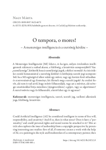 Nagy Márta: O tempora, o mores! - A mesterséges intelligencia és a szerzőség kérdése. In: Modernség és modernitás. pp. 201-218. (2025)