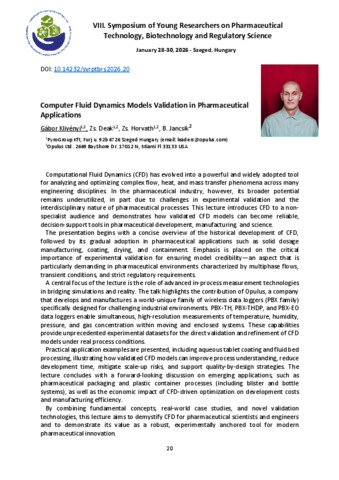 Klivényi Gábor; Deák Zs.; Horváth Zs.; Jancsik B.: Computer fluid dynamics models validation in pharmaceutical applications : [abstract].
