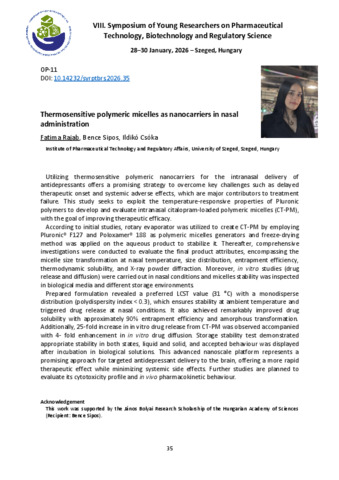 Rajab Fatima; Sipos Bence; Csóka Ildikó: Thermosensitive polymeric micelles as nanocarriers in nasal administration : [abstract].