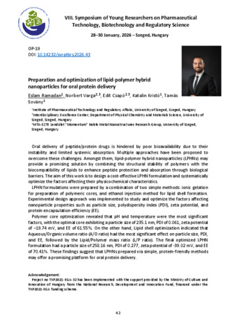 Ramadam Eslam; Varga Norbert; Csapó Edit; Kristó Katalin; Sovány Tamás: Preparation and optimization of lipid-polymer hybrid nanoparticles for oral protein delivery : [abstract].