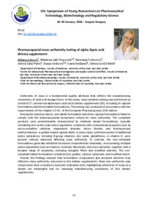 Vuković Milana; Lalić-Popovića Mladena; Todorović Nemanja; Čanji Panić Jelena; Vesković Dunja; Smiljanić Ivana; Jovičić-Bata Jelena: Pharmacopoeial mass uniformity testing of alpha-lipoic acid dietary supplements : [abstract].