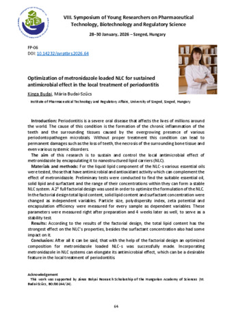 Budai Kinga; Budai-Szűcs Mária: Optimization of metronidazole loaded NLC for sustained antimicrobial effect in the local treatment of periodontitis : [abstract].