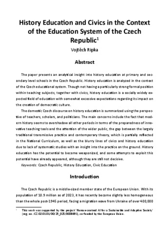 The paper presents an analytical insight into history education at primary and secondary level schools in the Czech Republic. History education is analyzed in the context of the Czech educational system. Though not having a particularly strong formal position within teaching subjects, together with civics, history education is a socially widely expected field of education with somewhat excessive expectations regarding its impact on the creation of democratic culture. The domestic Czech discourse on history education is summarized using the perspective of teachers, scholars, and politicians. The main concerns include the fact that modern history seems to overshadow all other periods in terms of the preparedness of innovative teaching tools and the attention of the wider public, the gap between the largely traditional transmissive practice and contemporary theory, which is partially reflected in the National Curriculum, as well as the blurry lines of civics and history education due to lack of systematic studies with an insight into the practice on the ground. History education has the potential to become weaponized, and some attempts to exploit this potential have already appeared, although they are still not decisive.
