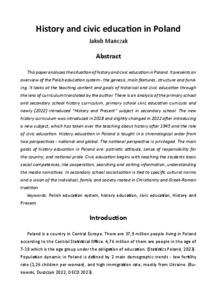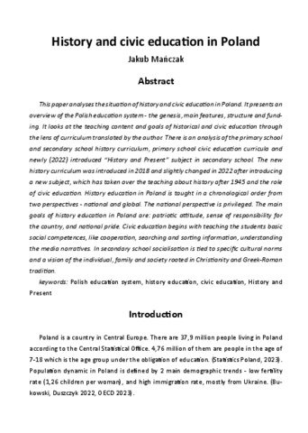 This paper analyses the situation of history and civic education in Poland. It presents an overview of the Polish education system - the genesis, main features, structure and funding. It looks at the teaching content and goals of historical and civic education through the lens of curriculum translated by the author. There is an analysis of the primary school and secondary school history curriculum, primary school civic education curricula and newly (2022) introduced “History and Present” subject in secondary school. The new history curriculum was introduced in 2018 and slightly changed in 2022 after introducing a new subject, which has taken over the teaching about history after 1945 and the role of civic education. History education in Poland is taught in a chronological order from two perspectives - national and global. The national perspective is privileged. The main goals of history education in Poland are: patriotic attitude, sense of responsibility for the country, and national pride. Civic education begins with teaching the students basic social competences, like cooperation, searching and sorting information, understanding the media narratives. In secondary school socialisation is tied to specific cultural norms and a vision of the individual, family and society rooted in Christianity and Greek-Roman tradition.