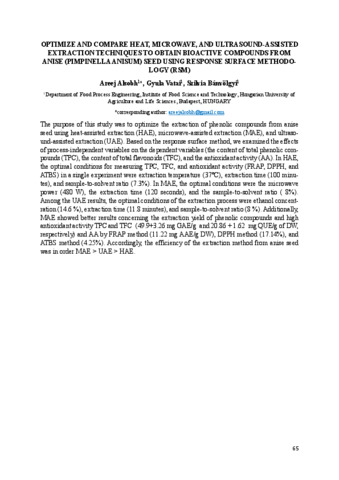 Alsobh Areej; Vatai Gyula; Bánvölgyi Szilvia: Optimize and compare heat, microwave, and ultrasound-assisted extraction techniques to obtain bioactive compounds from anise (Pimpinella anisum) seed using response surface methodology (RSM) : [abstract].