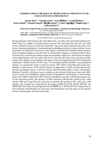 Kiss Karina; Ksa Tammam; Molnár Anna; Kovács Vanda; Rafael Bence; Szegedi Botond; Homa Mónika; Vágvölgyi Csaba; Papp Tamás; Szebenyi Csilla: Understanding the role of spore surface proteins to Mucor lusitanicus physiology : [abstract].