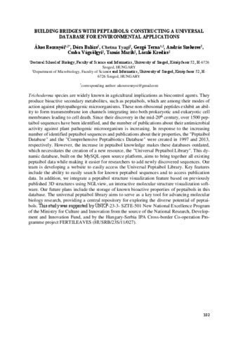 Rozsnyói Ákos; Balázs Dóra; Tyagi Chetna; Terna Gergő; Szekeres András; Vágvölgyi Csaba; Marik Tamás; Kredics László: Building bridges with peptaibols: constructing a universal database for environmental applications : [abstract].