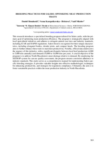 Simakoski Daniel; Karapetkovska-Hristova Vesna; Nikolov Vasil: Breeding practices for Salers: optimizing meat production traits : [abstract].