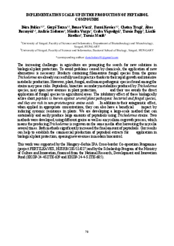 Balázs Dóra; Terna Gergő; Váczi Bence; Kovács Fanni; Tyagi Chetna; Rozsnyói Ákos; Szekeres András; Varga Mónika; Vágvölgyi Csaba; Papp Tamás; Kredics László; Marik Tamás: Implementation scale-up in the production of peptaibols : [abstract].
