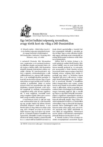 Borsos Mátyás: Egy letűnt balkáni népesség nyomában, avagy török kori rác világ a Dél-Dunántúlon : [könyvismertetés]. In: Aetas, (40) 2. pp. 196-199. (2025)