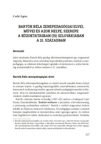 Csehi Ágota: Bartók Béla zenepedagógiai elvei, művei és azok helye, szerepe a közoktatásban (is) Szlovákiában a 21. században.